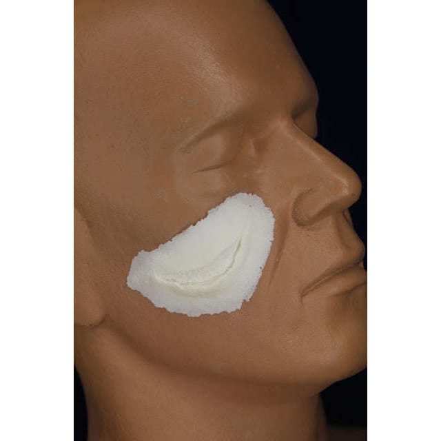 For the best possible results with your Wide Cut Foam Latex Prosthetic, apply skin safe adhesive to the piece up to the edges but NOT on the edge itself, and let the piece dry completely. Using a cotton swab or makeup sponge, apply adhesive to the skin, making sure the adhesive covers a larger surface area than the prosthetic will. Let dry.